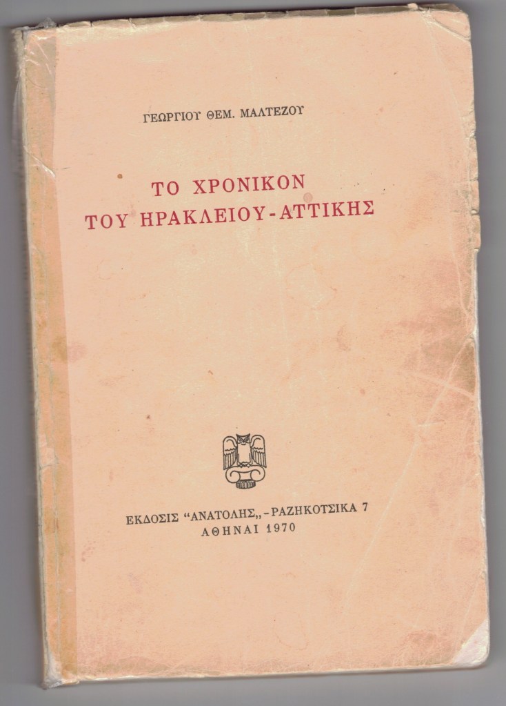 | 4 | Μαλτέζος Γεώργιος Θ., «Το χρονικόν του Ηρακλείου Αττικής», Εκδόσεις Ανατολής, 1970. |