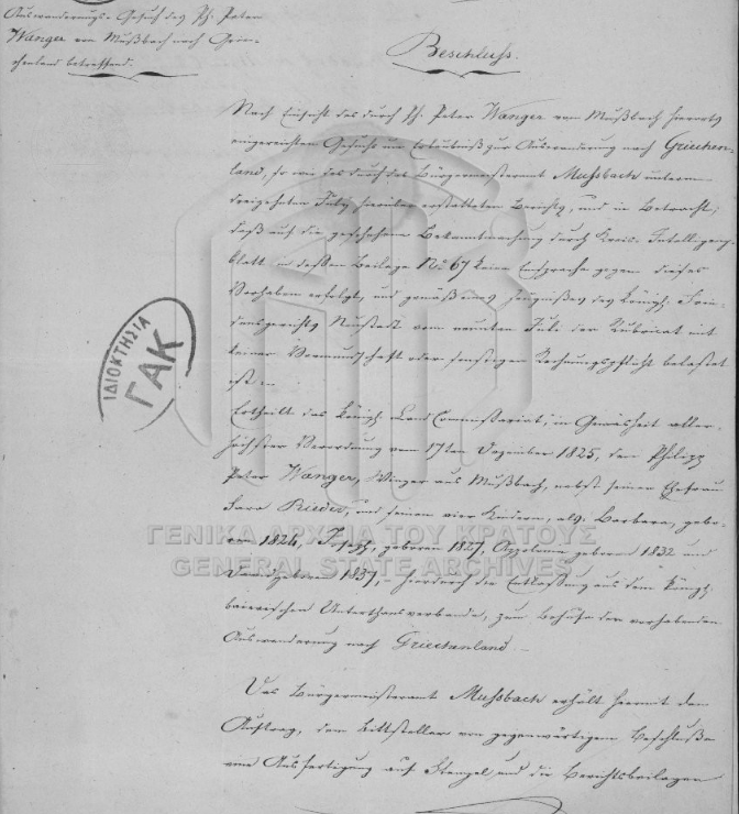 Ertheilt das königliche Land Commissariat, in Gemäßheit aller höchster Verordnung vom 17ten Dezember 1825. dem Philipp Peter Wanger, Winzer aus Mußbach, nebst seinen Ehefrau Sara Rieder, und seinen vier Kindern, als: Barbara, geboren 1824, Joseph, geboren 1827, Appolonia geboren 1832 und David geboren 1837. hierdurch die Entlassung aus dem königlichen baierischen Unterthansverbande, zum Behufe der vorhabenden Auswanderung nach Griechenland.